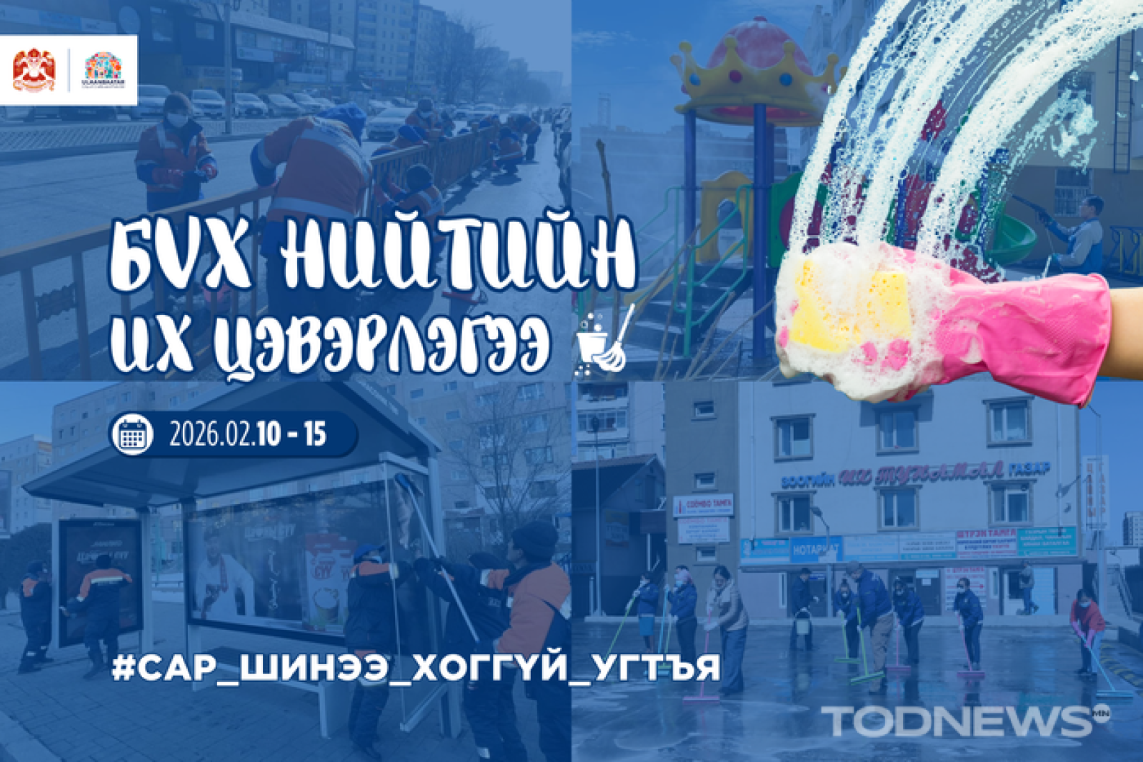 Улаанбаатар хотын нийтийн эзэмшлийн гудамж, зам, талбай, гэр болон орон сууцны хорооллын цэвэрлэгээ үйлчилгээг сайжруулах, иргэдийн ая тухтай ажиллаж, амьдрах орчин, нөхцөлийг бүрдүүлэх зорилгоор сар шинийн баярыг угтсан бүх нийтийн их цэвэрлэгээг энэ сарын 10-15-ны өдрүүдэд зохион байгуулна.