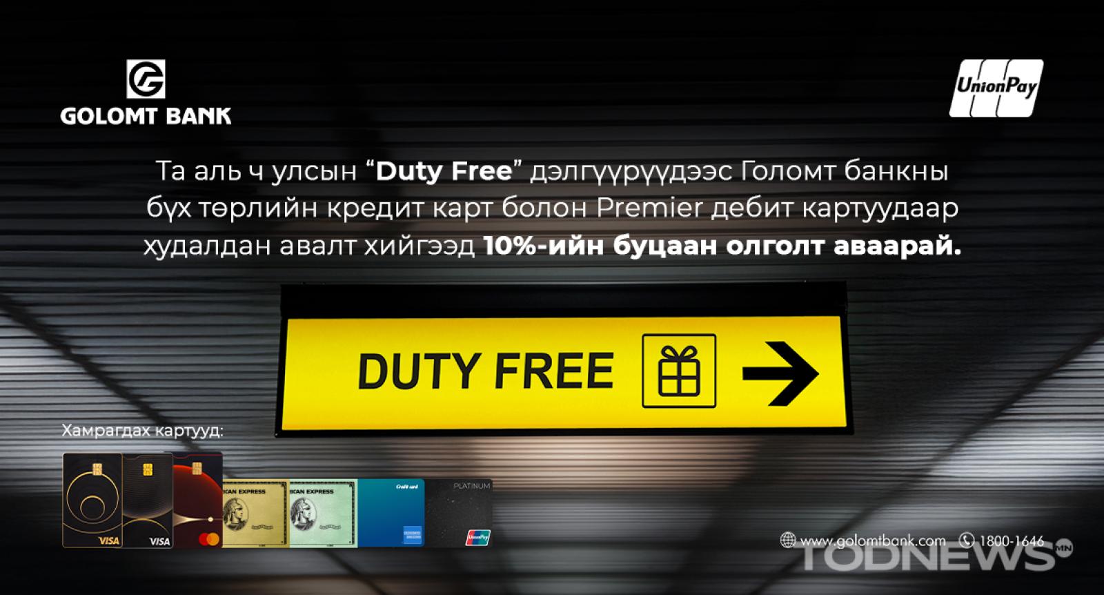 Голомт банк картын бүтээгдэхүүнээ төрөл бүрийн сонголттойгоор харилцагчдадаа хүргэж, карт тухай бүрд тохирсон хөнгөлөлт, урамшууллыг тогтмол хэрэгжүүлдэг. Харин энэ удаа гадаадад аялахдаа аль ч улсын DUTY FREE дэлгүүрээс Голомт банкны олон улсын эрхтэй картуудаар худалдан авалт хийгээд 10%-ийн буцаан олголт авах боломжтой урамшууллыг хэрэгжүүлж эхэллээ.