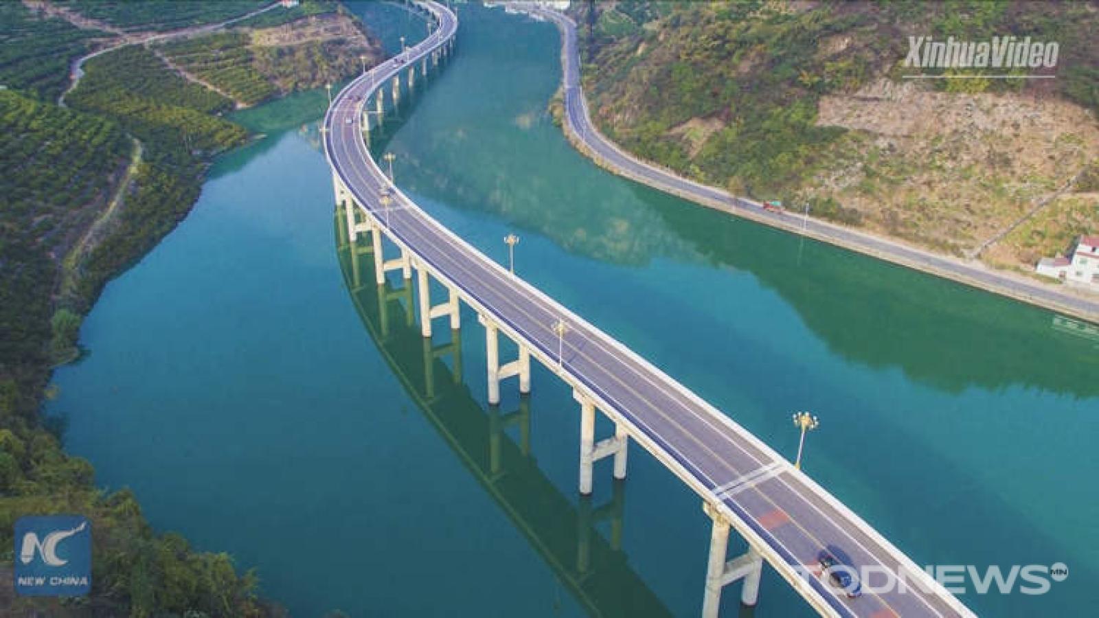 Хятадын Хубэй мужийн уулархаг голын хөндийд Азийн хамгийн гайхалтай дэд бүтцийн хэсгүүдийн нэг болох голын дундуур тавигдсан хурдны замын гүүр байрладаг.
