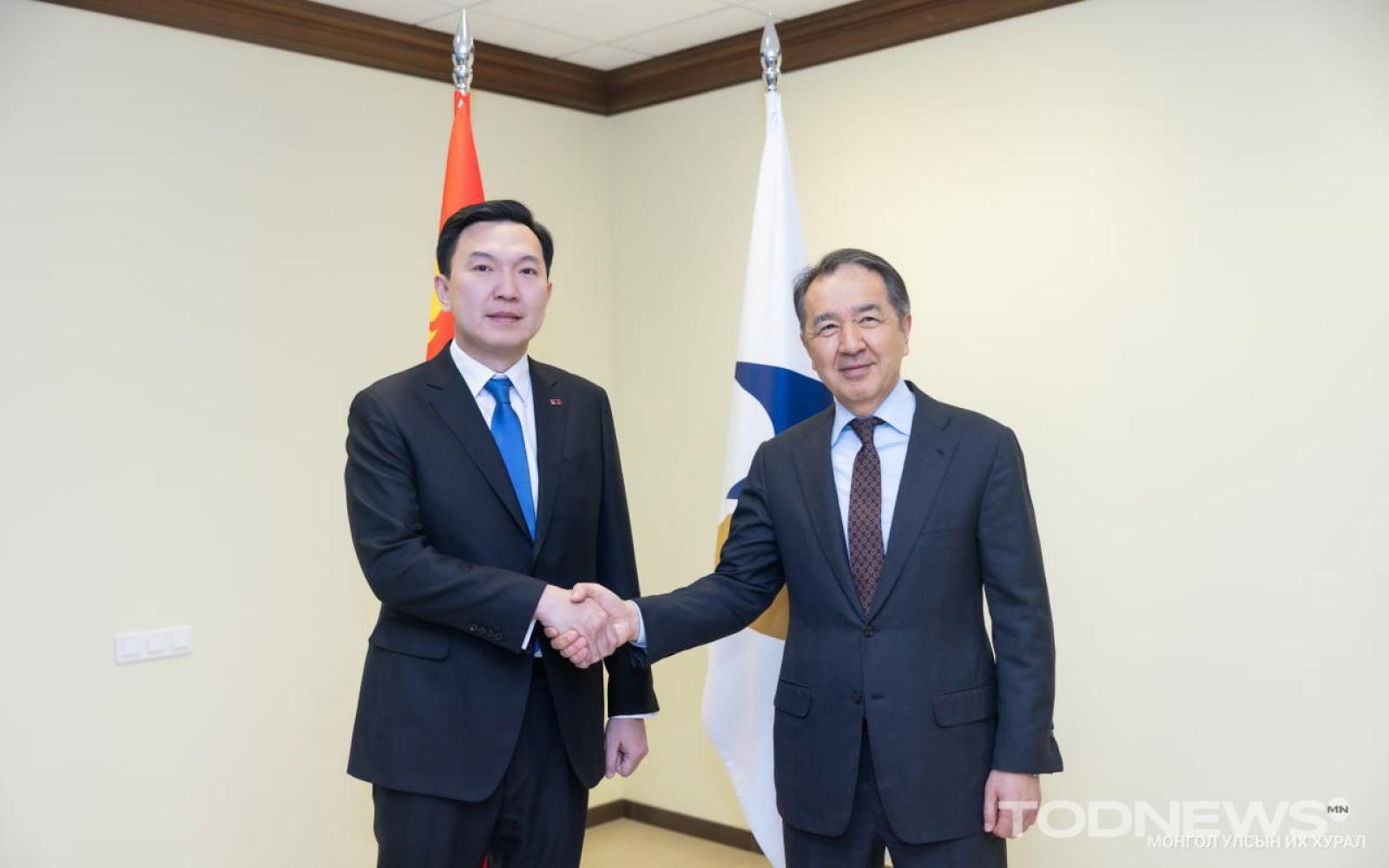 Монгол Улсын Их Хурлын дарга Н.Учрал Оросын Холбооны Улсад хийж буй албан айлчлалынхаа эхний өдөр (2026.02.09) Евразийн эдийн засгийн комиссын Сайд нарын зөвлөлийн дарга Бакытжан Абдирович Сагинтаевтай уулзлаа. Уулзалтын эхэнд УИХ-ын дарга Н.Учрал Евразийн эдийн засгийн холбооны гишүүн орнууд болох ОХУ, Армени, Беларусь, Казахстан, Киргиз зэрэг улстай найрсаг харилцаа, хамтын ажиллагаагаа улам бүр гүнзгийрүүлэн хөгжүүлэх нь Монгол Улсын гадаад бодлогын тэргүүлэх чиглэлийн нэг болохыг онцлов.