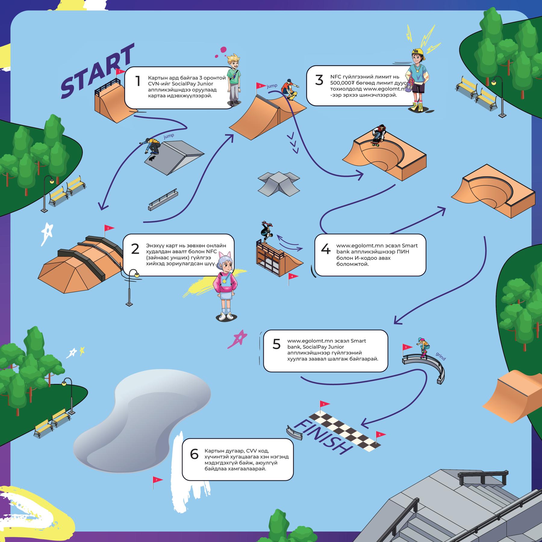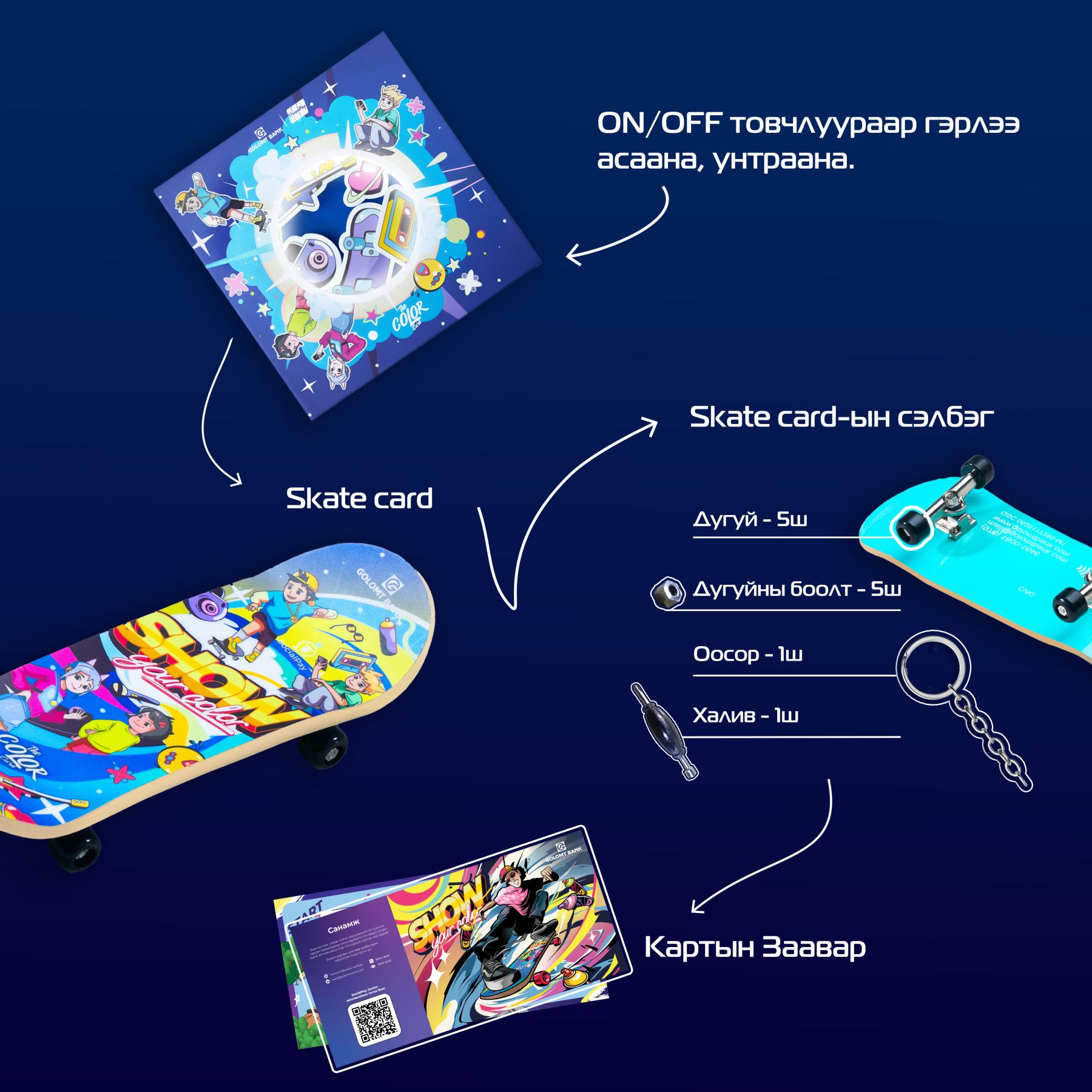 Энэ бол 7-22 насны хүүхэд, залуучуудад зориулсан SKATE CARD юм. Skate card нь банкны картын мэдээллийг суулгасан skateboard модель гэдгээрээ энгийн төлбөрийн картаас ялгаатай бөгөөд NFC технологийг ашиглан бүх төрлийн ПОС төхөөрөмж дээр уншихаас гадна И-коммерс дээр онлайнаар худалдан авалт хийх боломжтой төлбөрийн хэрэгсэл юм. 7-22 насны хүүхэд, залуус Skate card-ийн хэрэглэгч болсноор бага наснаасаа мөнгөтэй харьцаж, төлбөр тооцоогоо удирдаж, санхүүгийн зөв хэрэглээнд суралцахаас гадна шинэлэг, өвөрмөц, дизайн бүхий fingerboard-ийг өөрийн хэв маяг, загварын нэг хэсэг болгон ашиглах боломжтойгоороо онцлогтой.