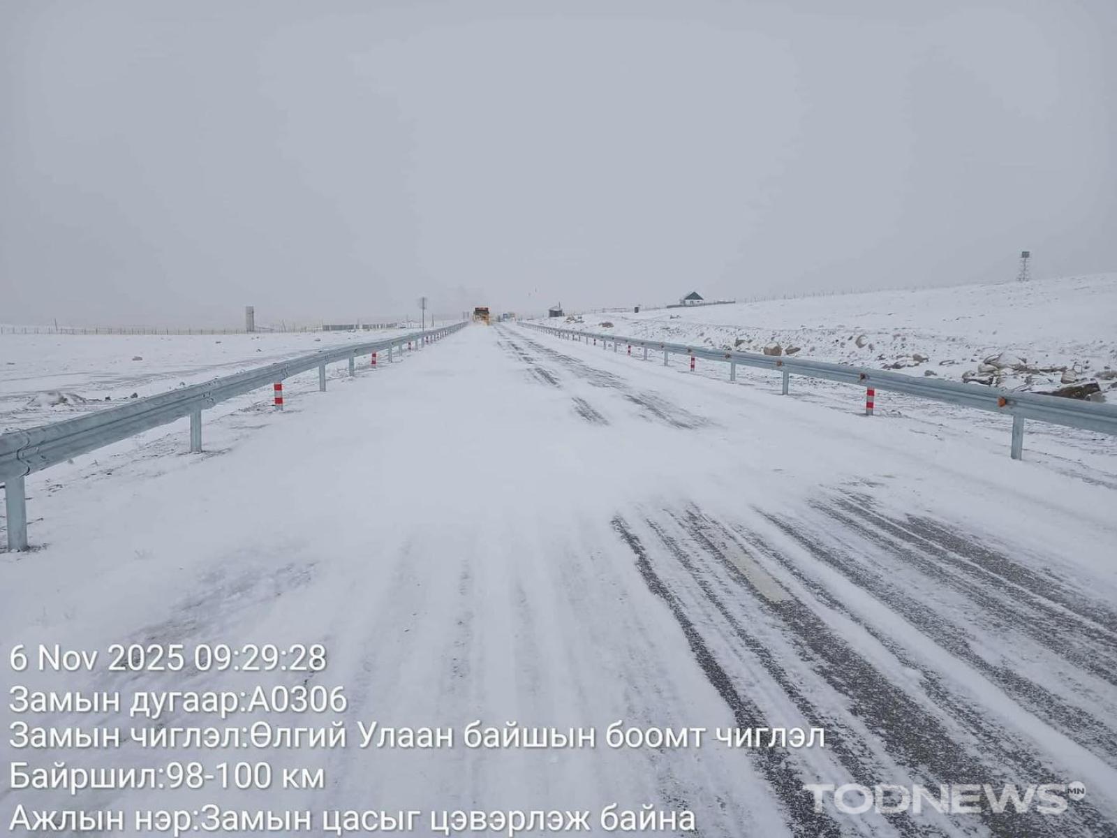 А0306 дугаартай Өлгий-Цагааннуур чиглэлийн Улаанбайшинт дахь шуурхай ажлын хэсэг авто замд хэсэгчлэн хунгарласан цасыг цэвэрлэж байна. Одоогоор хаагдсан зам, даваа байхгүй.