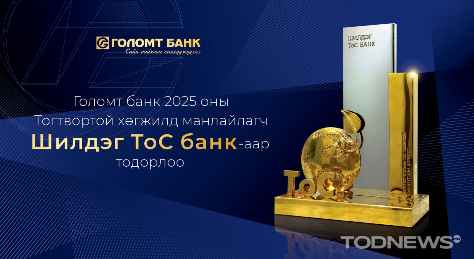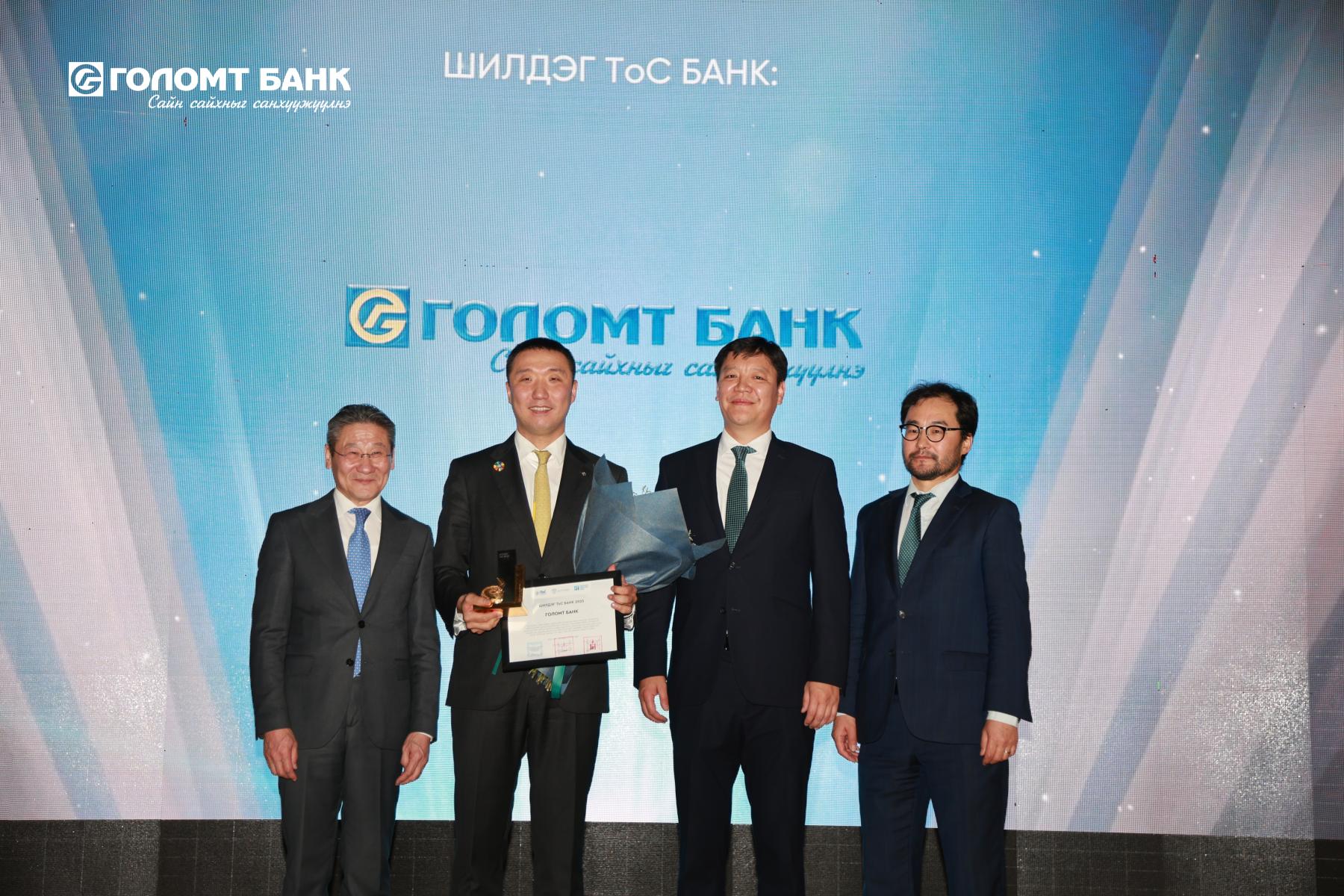 Монголбанк, Санхүүгийн зохицуулах хороо, Монголын Тогтвортой санхүүжилтийн холбоо (ТоС)-оос жил бүр тогтвортой санхүүжилтийн хэрэгжилтээр манлайлсан байгууллагуудаа шалгаруулдаг. 2025 онд Голомт банкны тогтвортой санхүүжилтийн тогтолцоог бэхжүүлэхэд оруулсан хувь нэмэр, тогтвортой санхүүжилтийн зарчмууд, олон улсын шилдэг туршлага, стандартыг санхүүгийн системд нэвтрүүлэн хэрэгжүүлж буйг үнэлэн “Шилдэг ТоС банк” хэмээх эрхэм хүндтэй шагналаар шагналаа.