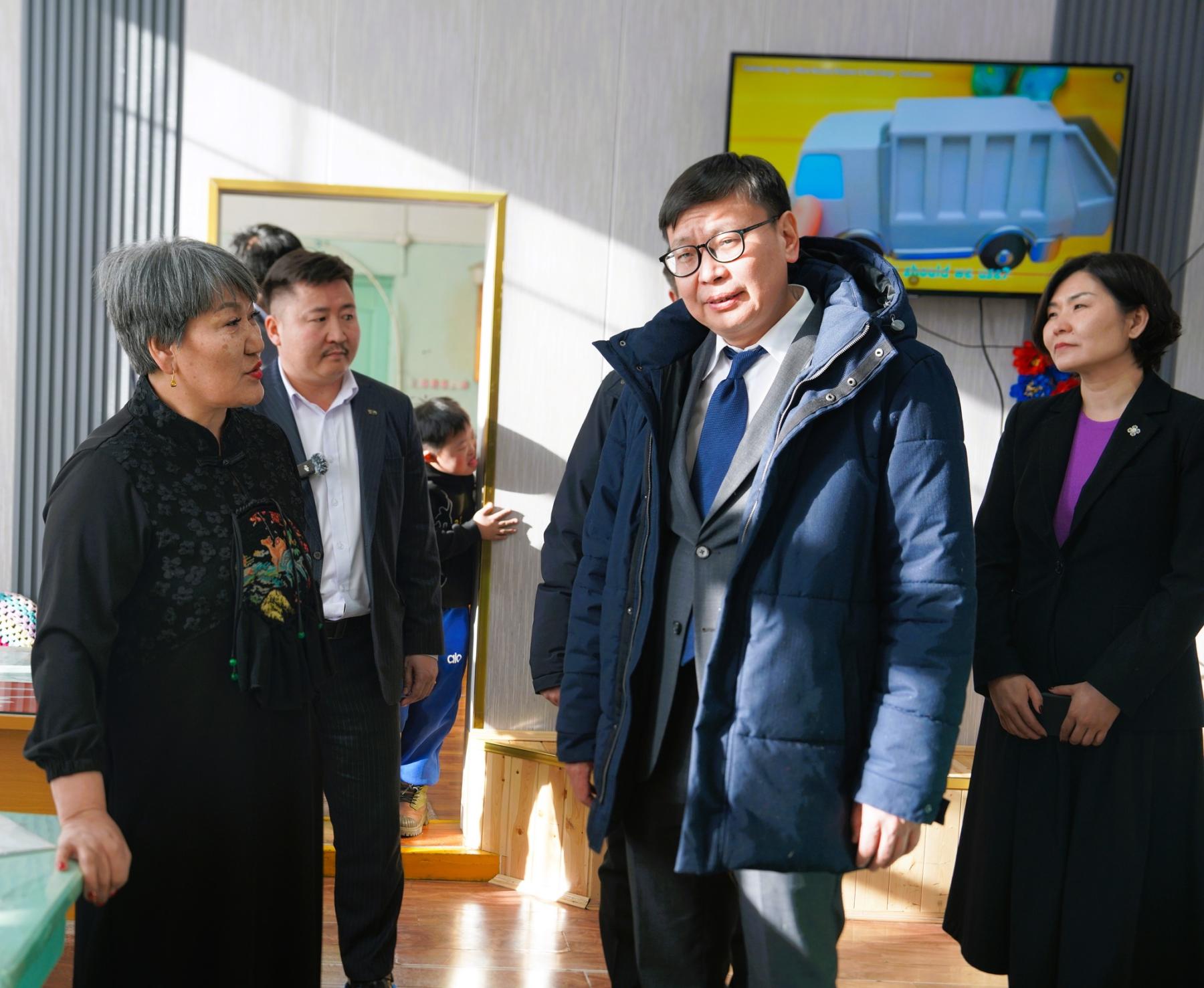 Дараа нь Арвайхээрийн 11 дүгээр цэцэрлэгийн үйл ажиллагаатай танилцлаа. Одоогийн байдлаар түрээсийн байранд үйл ажиллагаа явуулж буй уг цэцэрлэг 60 хүүхэдтэй байгаагаас 44 нь хөгжлийн онцлогтой, хүнд бэрхшээл бүхий хүүхдүүд байна. Улсын төсвийн хөрөнгө оруулалтаар баригдаж буй 150 ортой шинэ цэцэрлэг энэ ондоо багтан ашиглалтад орохоор тусгай хэрэгцээт хүүхдийн гурван бүлэг, энгийн хоёр бүлэгт хүүхдүүд нэмж авахаар төлөвлөж буй аж. Ялгаатай хэрэгцээт хүүхдүүдэд зориулсан иж бүрэн тоног төхөөрөмжөөр хангах хүсэлтийг цэцэрлэгийн эрхлэгч Б.Болормаа тавихад шийдэж өгнө гэдгээ салбарын сайд хэллээ.