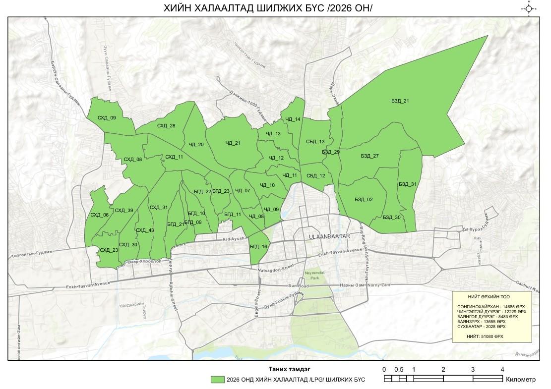 - Сонгинохайрхан дүүргийн 6, 8, 9, 11, 23, 28, 30, 31, 39, 43 дугаар хорооны 14685 өрх,