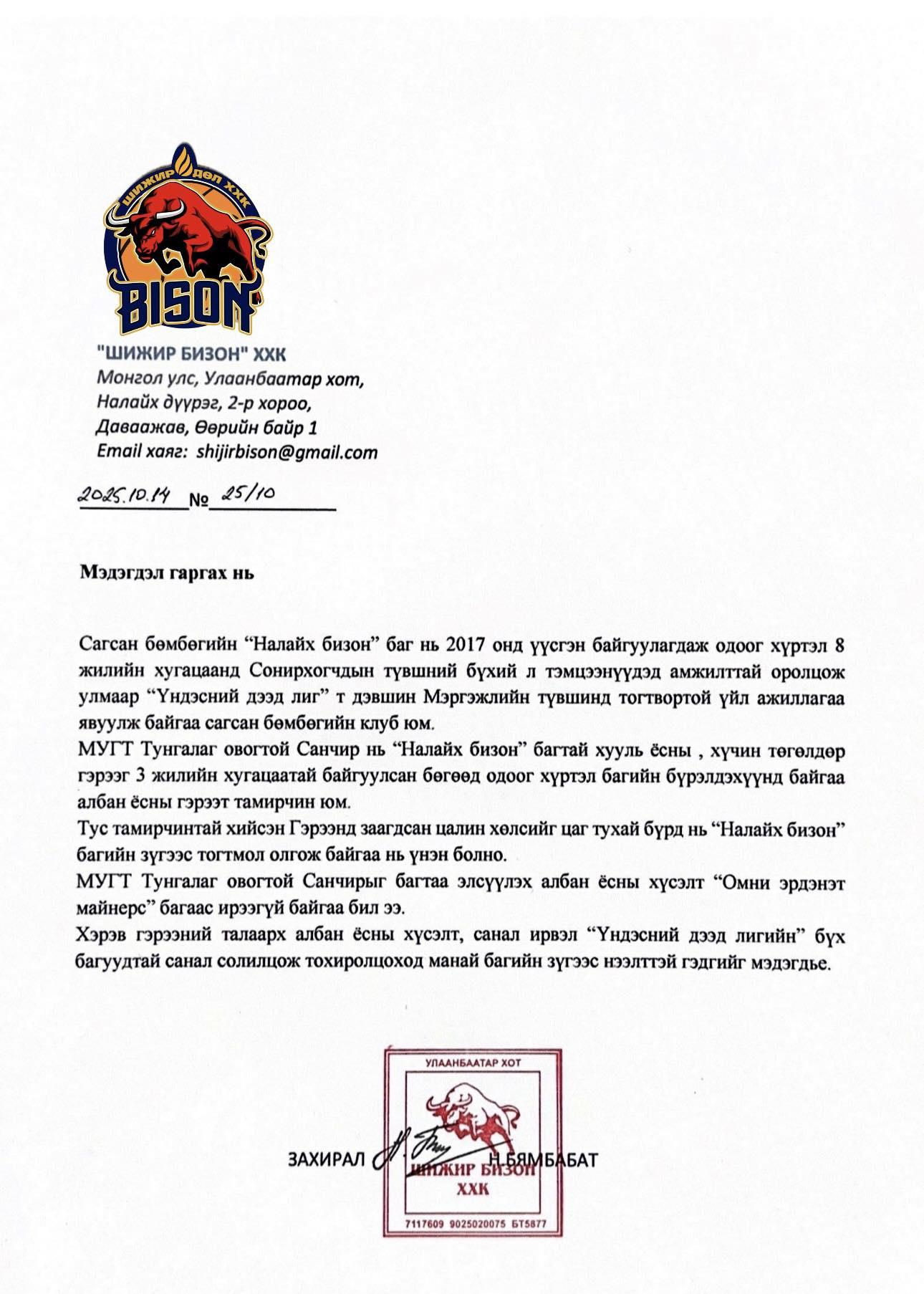 “МУГТ Г.Санчир нь манай Налайх Бизон багтай хууль ёсны, хүчин төгөлдөр 3 жилийн хугацаатай гэрээ байгуулан одоог хүртэл багийн бүрэлдэхүүнд байгаа гэрээт тамирчин бөгөөд, гэрээнд заагдсан цалин хөлсийг цаг тухайд нь багийн зүгээс тогтмол олгож байгаа нь үнэн болно.” хэмээжээ.